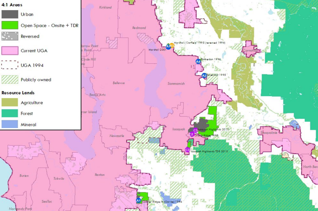 But cities like North Bend and Snoqualmie argue that the current UGA boundary, not the 1994 one, is what should be used to make planning decisions and that means allowing four-to-one development like in any other area.