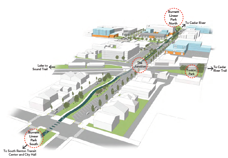 South of the Piazza, the City envisions additional green space linking King County’s Lake to Sound Trail to the Cedar River Trail. The intersection of S 4 th St and Burnett Ave S will be known as “The Junction,” and will provide seamless access to an assortment of regional trails from Renton’s downtown core.