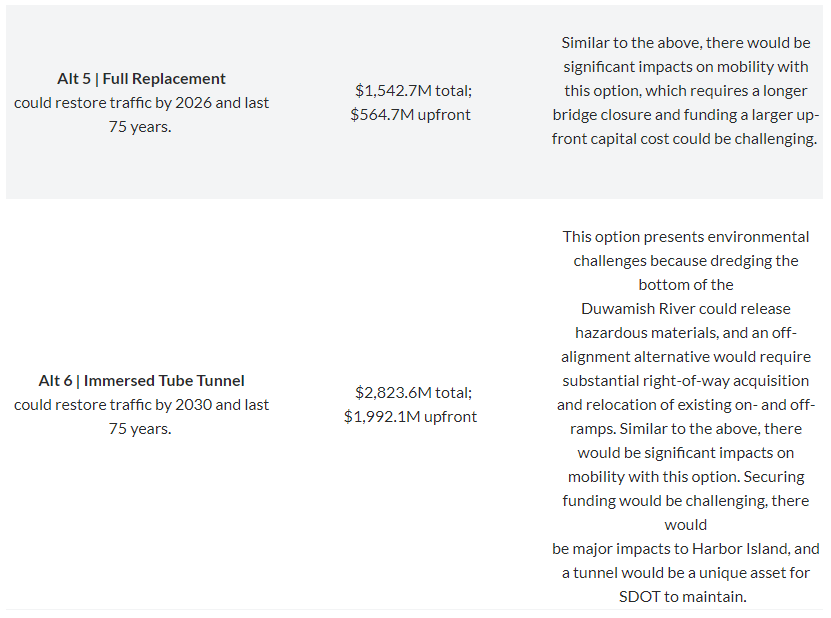 Replacement isn’t cheap either and requires more money upfront, but it offers more certainty. WSP puts superstructure replacement at $1 billion total with $383.1 million upfront. The other replacement options–full replacement and the immersed tube tunnel are even spendier with the immersed tube requiring almost $2 billion upfront. The immersed tube is complicated by environmental factors–the Duwamish River is a superfund site and disturbing the riverbed could release more pollution.