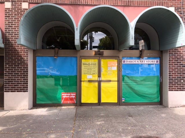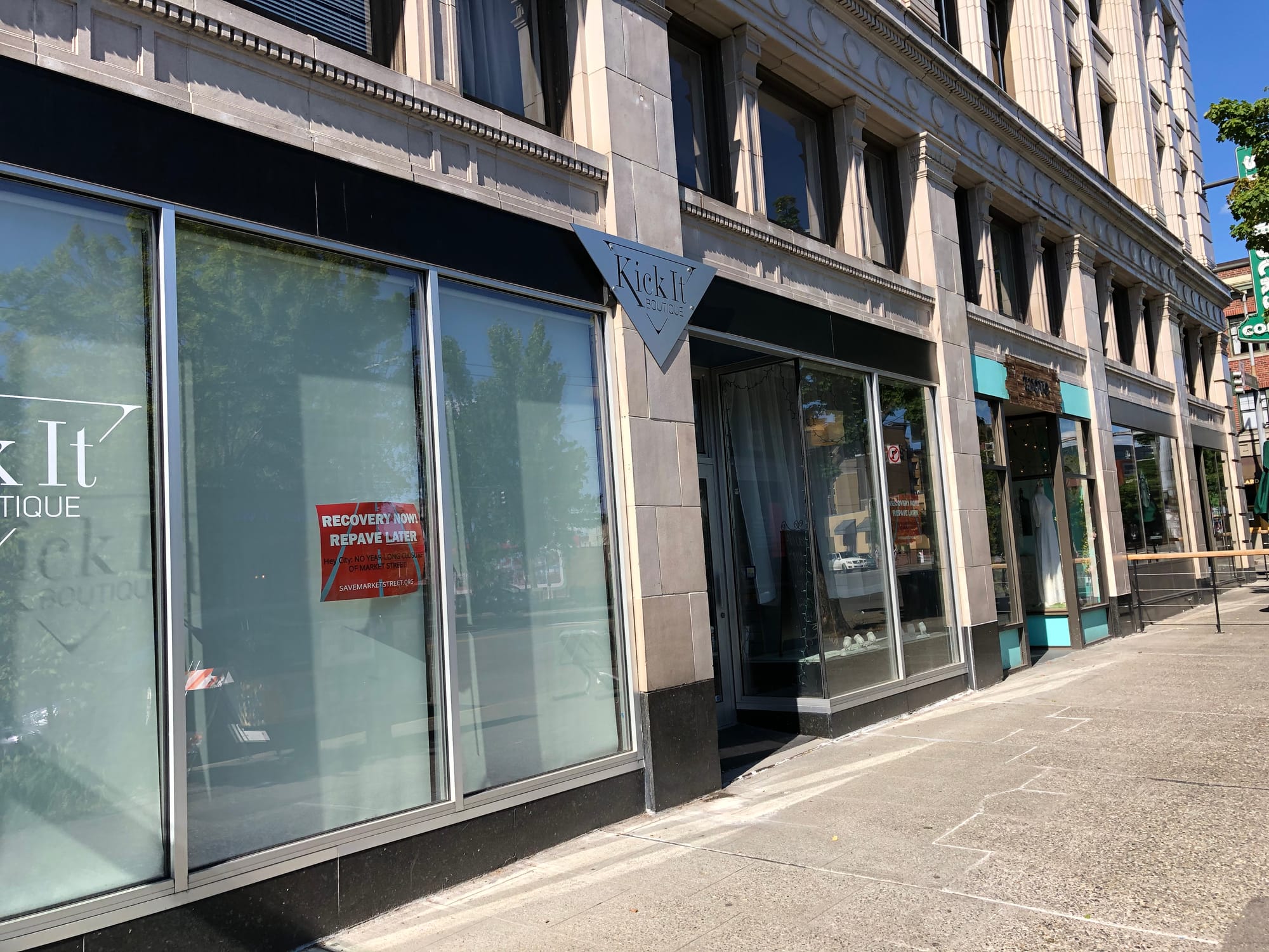 Business windows along Market Street in Ballard have been featuring a new sign. In addition to reduced hours with delivery information and the murals painted over plywood panels, there are signs saying “Recovery Now! Repave Later!” appearing in shops and restaurants.