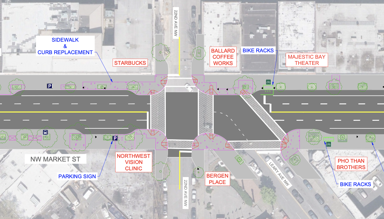 SDOT identifies NW Market St as “an east-west arterial and considered a major truck street in Seattle’s freight network” though years of changes have made such designations antiquated at best. Most segments of the road are 60 feet wide with four travel lanes. While Market Street is the major route through the Ballard Urban Village, the designs for repaving show SDOT is not actually considering Market Street as an Urban Village arterial. The road is being rebuilt as a major urban highway.