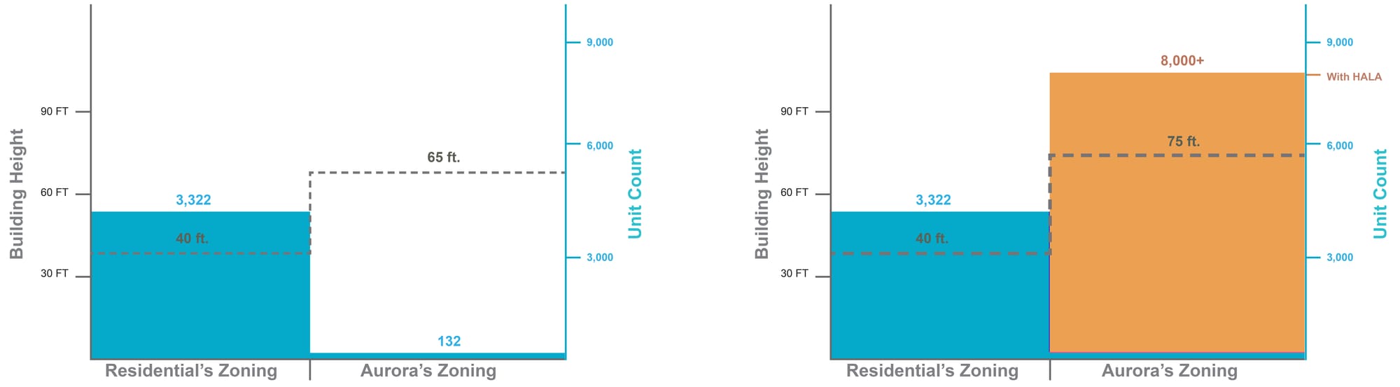 It’s now 2018 and the city is turning to its urban villages once again to handle the city’s unprecedented growth. But for Aurora-Licton Springs, where can that be? The residential land has achieved the city’s goals and has some room to grow, but not at the highest capacity available. In addition to being adjacent to the highest served transit line in the city, the commercial land has the tallest allowable construction opportunities (ranging from 40 to 65 feet in height).