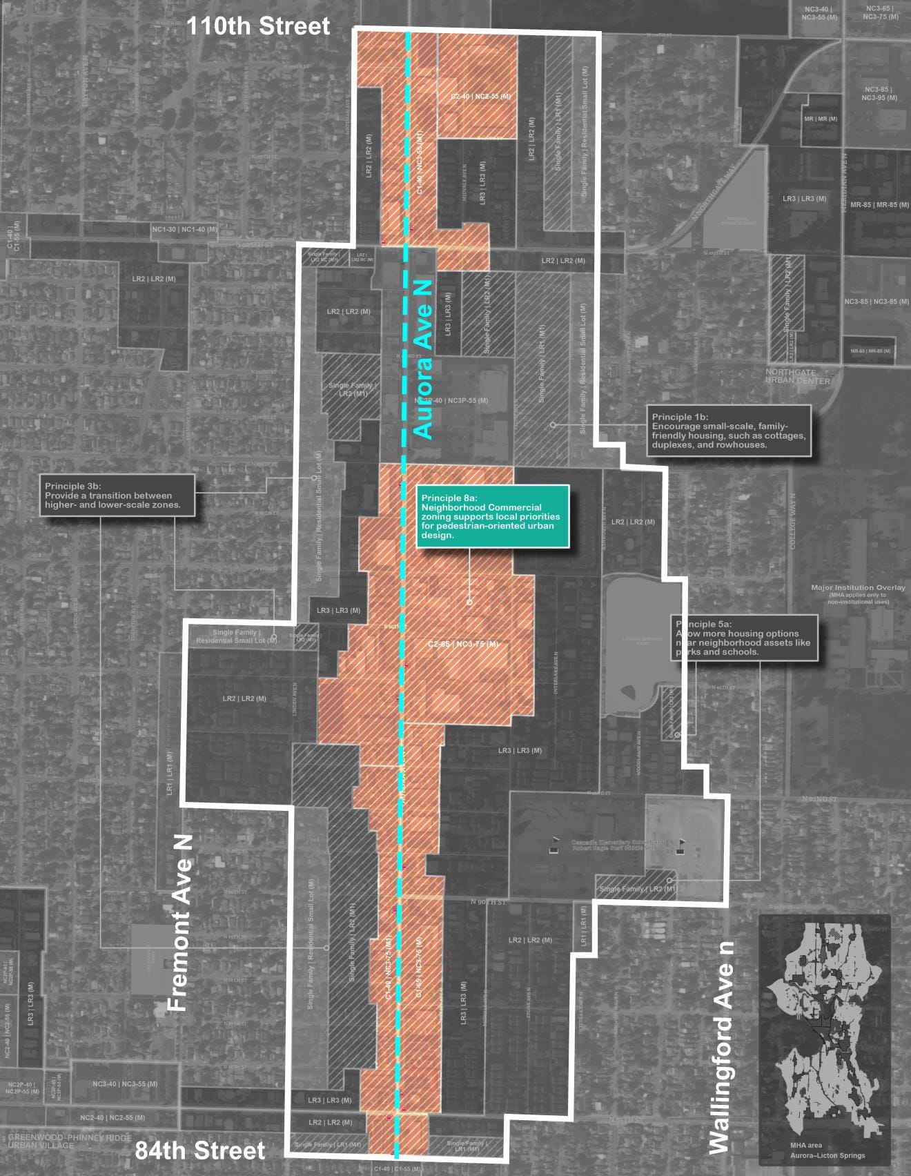 In 2014, that goal of 75% growth was achieved by adding 74.7% of the city’s housing units within these 30 urban village boundaries. One of those neighborhoods, the Aurora Licton-Springs Urban Village, is centered on Aurora Avenue between N. 84th Street and N. 110th Street. The 212 acre urban village stretches several blocks to the east to the west of Aurora Avenue. Of the 212 acres, 155 acres is zoned residential while 57 acres is zoned commercial.