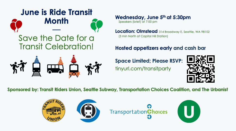 The Urbanist is excited to partner with the Transit Riders Union, Seattle Subway, and the Transportation Choices Coalition to host the first of many events for Ride Transit Month. The event will have hosted appetizers starting at 5:30pm and a brief program featuring speakers from a few local organizations starting at 7:00pm.