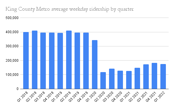 That quarterly figure converts to about 36,000 ridehailing fares per day. By comparison, King County Metro reports its bus ridership has continued to rebound from its pandemic doldrums and hit a new pandemic-era high of 217,000 boardings on June 1st. In 2019, Metro hovered around 400,000 average weekday boardings. In April, Metro ridership clocked in at 49% of its 2019 level.