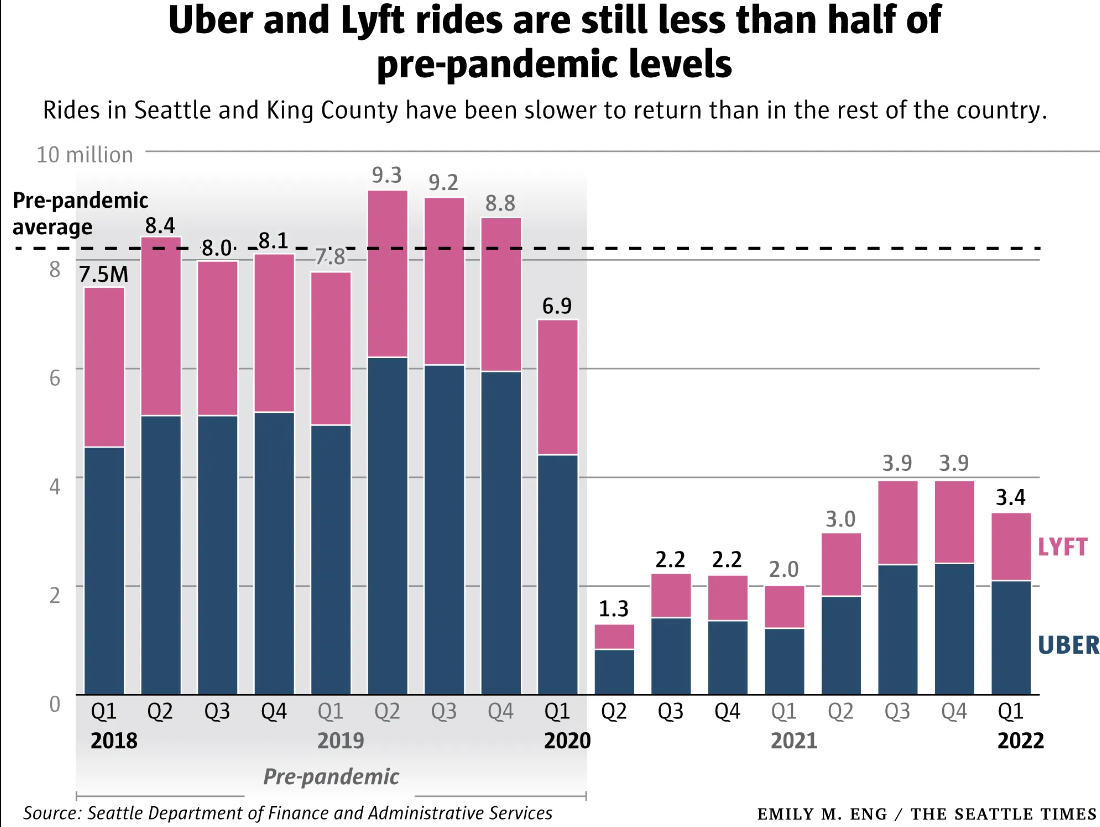 “In the first quarter of 2022, drivers for Uber and Lyft provided around 3.3 million rides in King County, according to data provided by the Seattle Department of Finance and Administrative Services through a public records request. That’s just 36% of the companies’ combined 2019 peak of 9.3 million rides,” David Kroman wrote. The companies claim to be at about 70% of normal ridership in most other metropolitan regions.