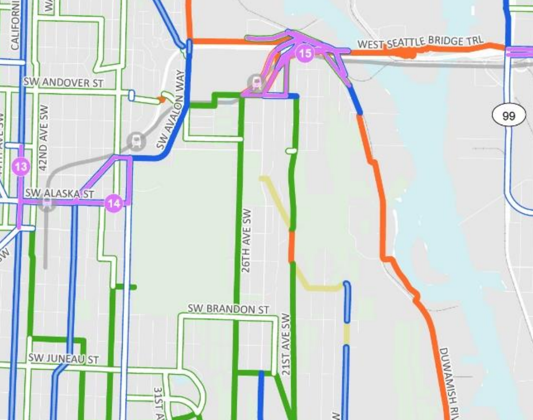 Longer-term, 26th Avenue SW is the only designated north-south bike route in the area. The 2014 Bicycle Master Plan called for protected bike lanes on Delridge Way, but the final design for the H Line project included only a southbound bike lane south of SW Juneau Street, and no bike facilities northbound. That leave no safe facility to connect to the West Seattle Bridge Trail or to the Alki Trail — other than transferring to a greenway.