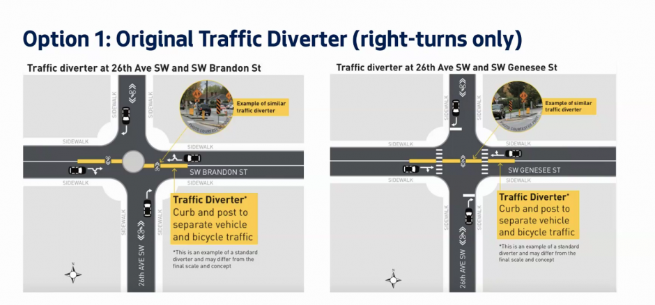 In 2020, as part of efforts to improve the 26th Avenue SW greenway in West Seattle, SDOT proposed installation of traffic diverters at two key intersections along the street: SW Brandon Street and SW Genesee Street. At the time, greenway users were dealing with both the West Seattle Bridge closure and increased traffic impacts from construction of the RapidRide H Line project along Delridge Way SW. Diverters would have prevented the greenway from being used as a substitute for Delridge for the full length of the corridor; drivers would have been required to take a right turn at either Brandon or Genesee.