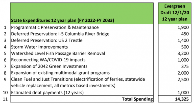 “The Saldaña proposal would span twelve years: evenly split among six two-year transportation budgets, that would amount to $333 million per biennium for transit, walking, and biking projects,” Packer wrote. “Governor Inslee’s proposed 2021-2023 budget only provided about $115 million, even with a one-time $20 million boost to pedestrian and bicycle grant program. A $2 billion investment over 12 years would absolutely be the biggest multimodal investment that has ever been made at the state level.” The Evergreen Plan also boosts investment in electrifying Washington’s ferry and transit fleets to the tune of $2.5 billion, expanding on Governor Jay Inslee’s proposal.