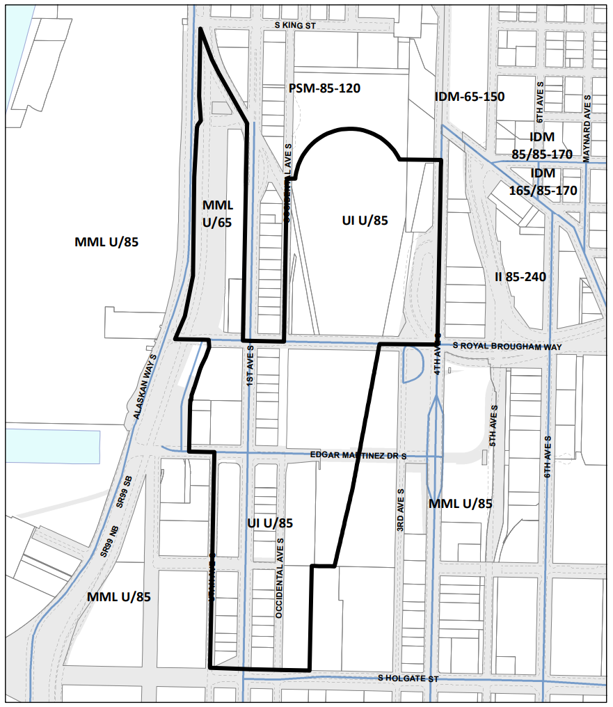 The idea of allowing residential uses around the south downtown stadiums, creating a “Maker’s District” with capacity for around 1,000 new homes, was considered by the City in its original analysis of the environmental impact of changes to its industrial zones in 2022. But including zoning changes needed to permit residential uses within the “stadium transition overlay district,” centered around First Avenue S and Occidental Avenue S, was poised to disrupt the coalition of groups supporting the broader package.