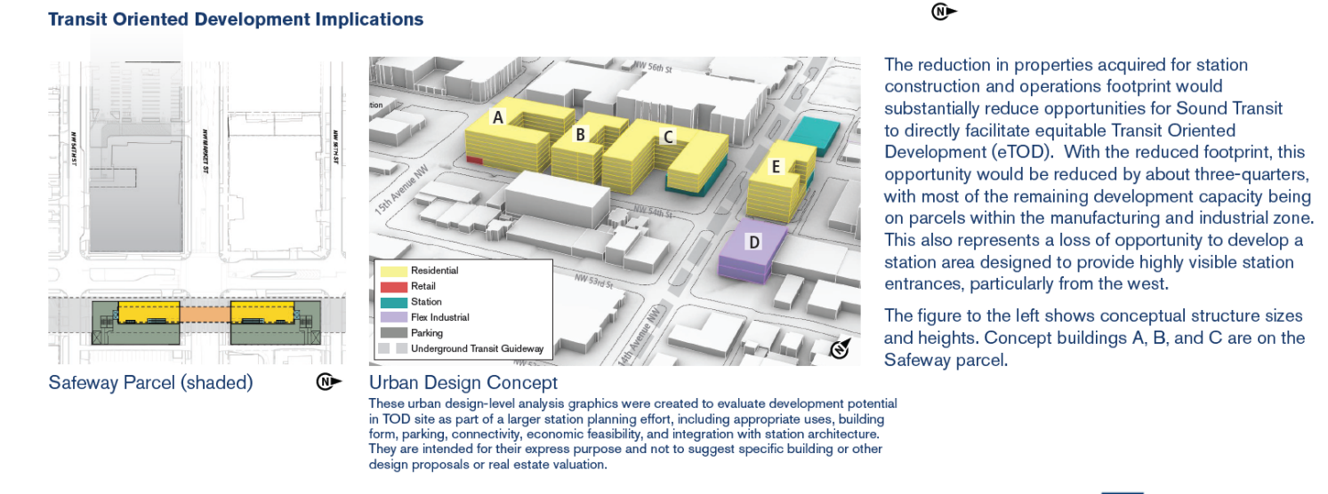 Two other modifications placed the station on 15th Avenue, and considered whether it should be located under the right of way for 15th Avenue or to the east with connections under the road. Both alignments anticipated acquiring properties on the southeast and southwest corners of the intersection, namely the Safeway block and the Walgreens. Alignment to the east of the road would also require properties to the south of 54th Street for emergency egress. A station under the road could shift north or south by several blocks, as drawn by transit-oriented development opportunities.