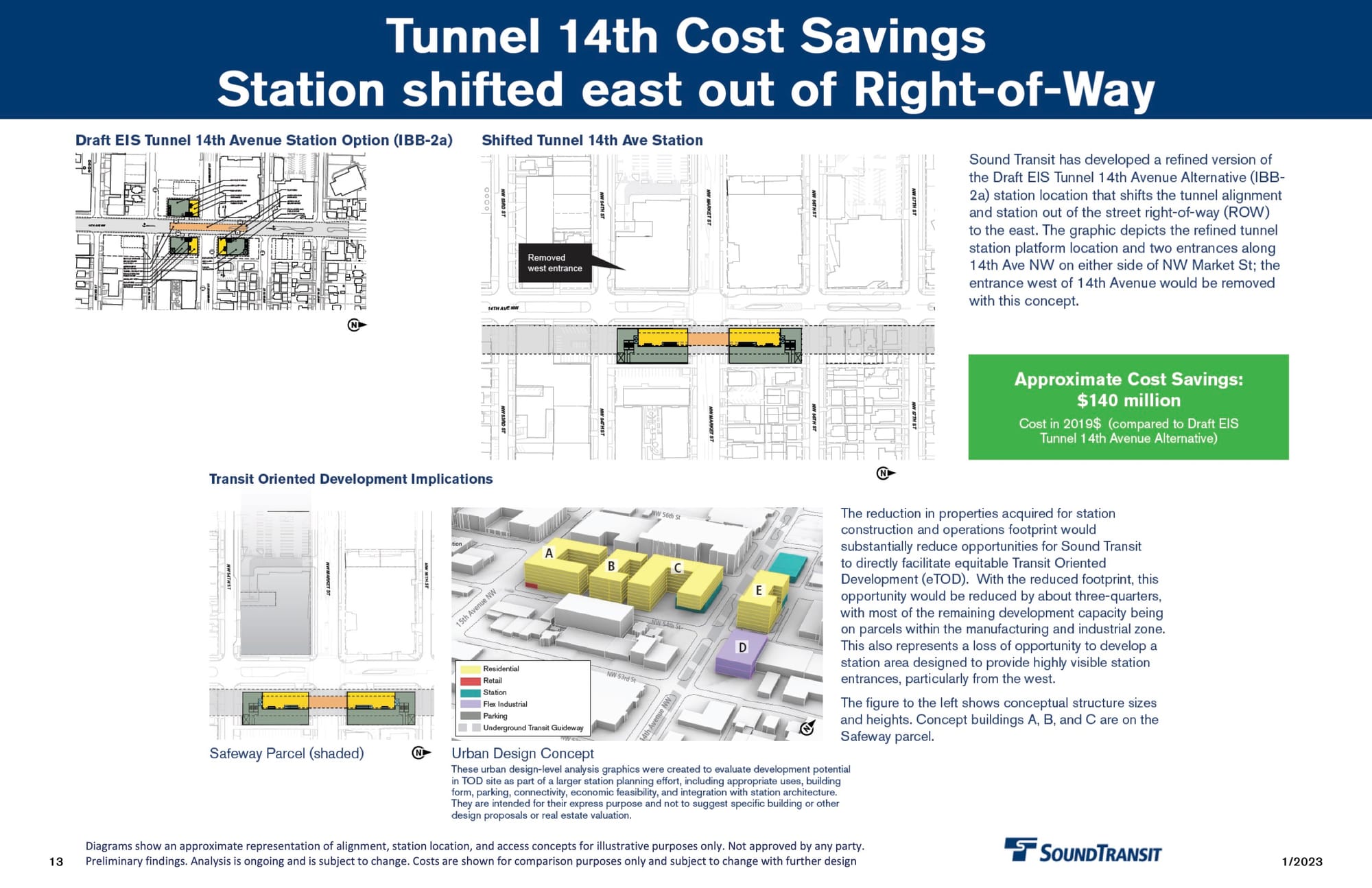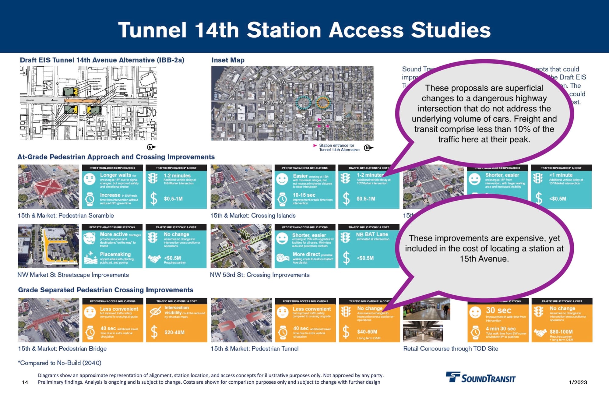 These modification appear in response to comments from The Urbanist, Seattle Subway, and like-minded advocates urging the agency to add a station entrance west of 15th Avenue or otherwise provide connection to the proposed station from denser parts of Ballard. Providing crossings on 15th Avenue adds significant costs to the agency’s preferred 14th Avenue station location, which is not included in the “cost savings” suggested by the agency’s analysis.
