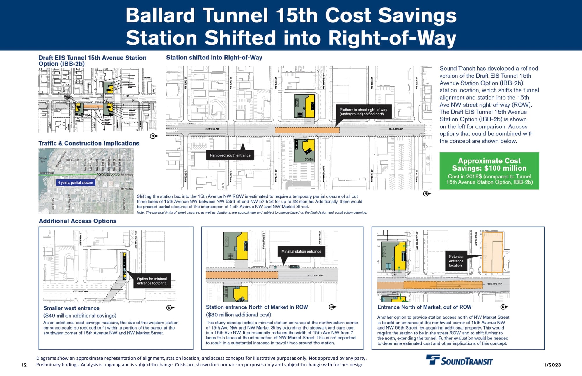 The most significant impact among these options is placing a station in the right of way would require partial closure of 15th Avenue over the course of four years. Both 15th Avenue options saved $100 million versus the preferred alignment. That is mitigated with every extra entrance, estimated at $30-$40 million each.