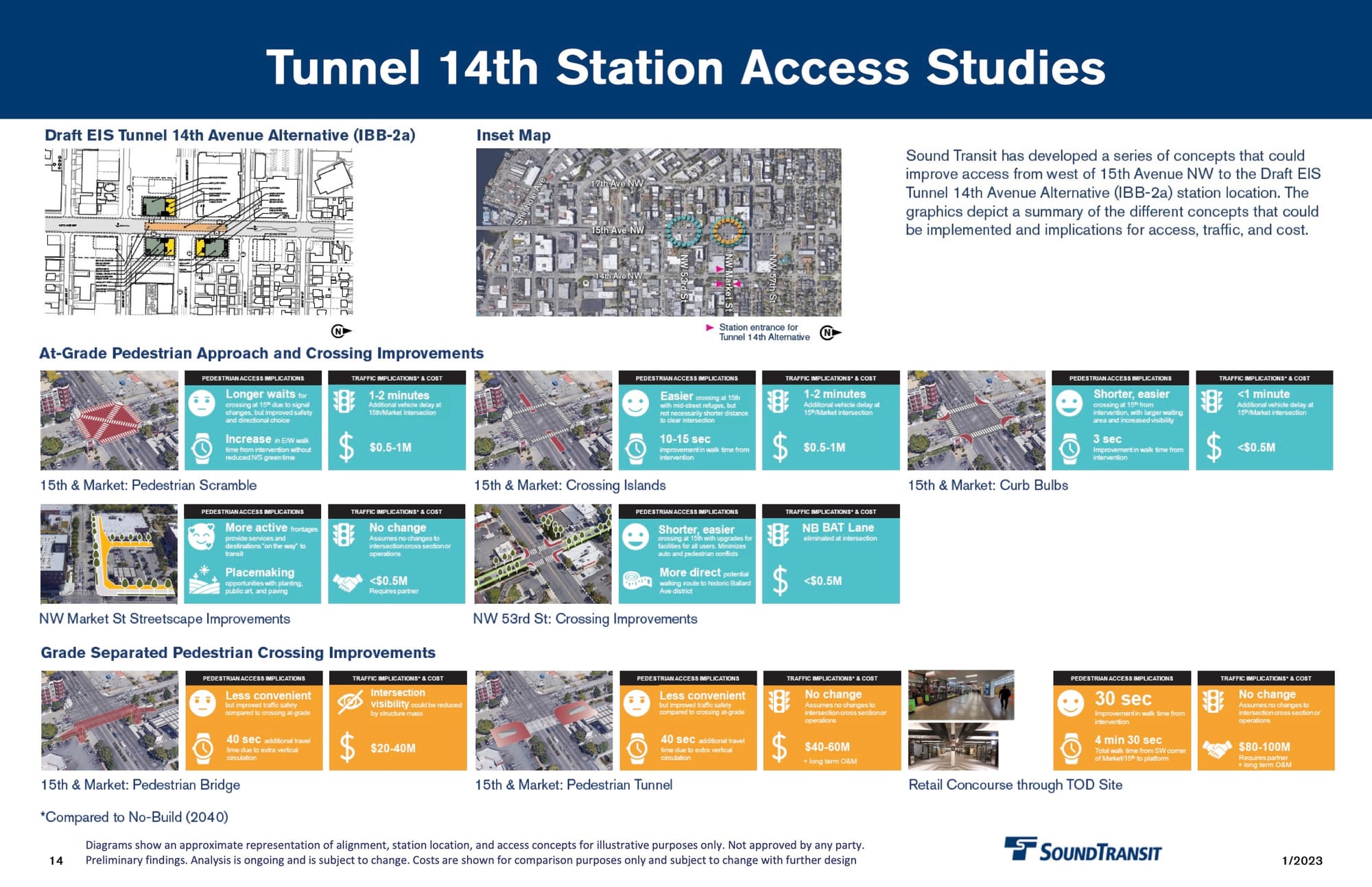 Finally, Sound Transit looked at several options for improving access across 15th Avenue, should the station end up located over on 14th. Those options included a pedestrian scramble, refuge islands, corner bulbs, as well as structures over and under the street. The on-street improvements ranged in costs but remained under $1 million. The pedestrian bridge or tunnel options are projected to run upwards of $20 million above ground to $100 million for an underground concourse.