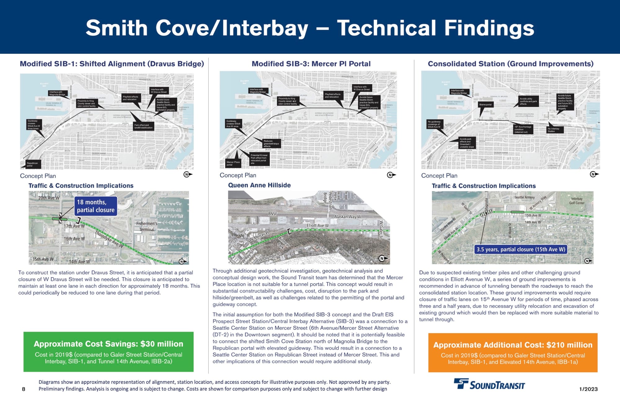 However, analysis identified “challenging ground conditions” that would require the soil under 15th Avenue to be shored up before digging due to unstable fill soils. Partial closure of 15th Avenue at the Magnolia Bridge would occur for one and a half years. The additional cost of consolidating stations is $210 million due to the buried station amid soil issues.