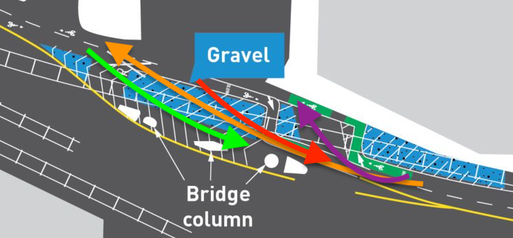 The intent of the gravel pits was to force people biking to cross the railroad tracks at a perpendicular angle or close to it. SDOT has further changes, such as fencing and a new crossing location, planned to reinforce that behavior. However, because SDOT designed a tight and awkward turn to cross the tracks, many people biking attempt to cross at different locations in order to avoid the slow, awkward pinchpoint or a potential collision with oncoming bike traffic navigating the hazard from the opposite direction.