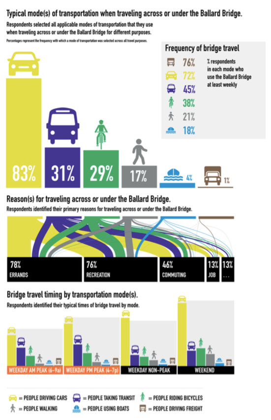 Preliminary information from SDOT’s online survey shows that almost as many users responded that they cross the bridge by transit, biking, or walking (total of 77%) as by automobile (83%), and usage of bikes for transportation (29%) was approached reported transit usage (31%).