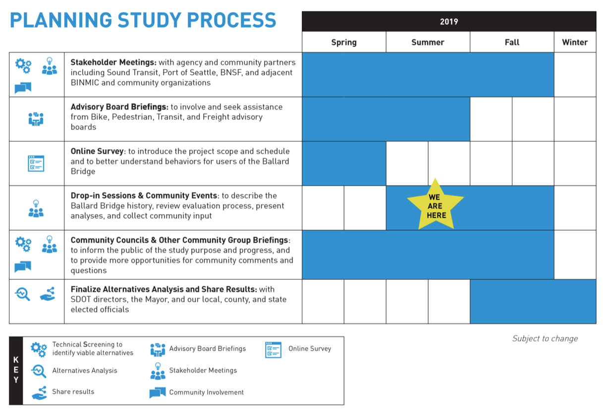 Readers who want to keep up-to-date with the Ballard Bridge Planning Study can sign up for the project listserv. Questions and comments can also be emails to the project team at BallardBridge@seattle.gov.