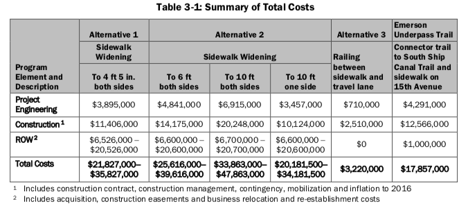 The agency’s response can be attributed at least in part to the high cost of rehabilitating the bridge. A 2017 Ballard Bridge Sidewalk Widening Concept Study completed for SDOT by consultant firm BergerABAM showed steep costs for all three alternatives examined. For example, Alternative 1, which would only widen the sidewalk to about four and a half feet on both sides, was estimated to cost anywhere from $21 to $36 million dollars.