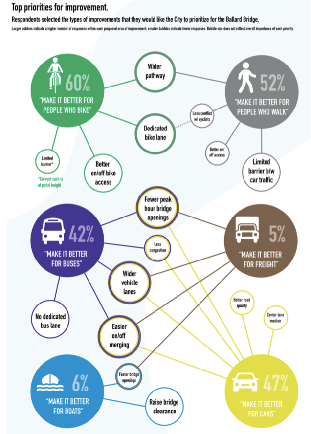 With these relatively high usage rates, it’s not a surprise that a majority of respondents cited improving safety infrastructure for biking and walking as at the top of their list of priorities for the bridge, especially since the Ballard Bridge is known for narrow sidewalks that squeeze pedestrians and cyclists into a roughly three and a half foot space.