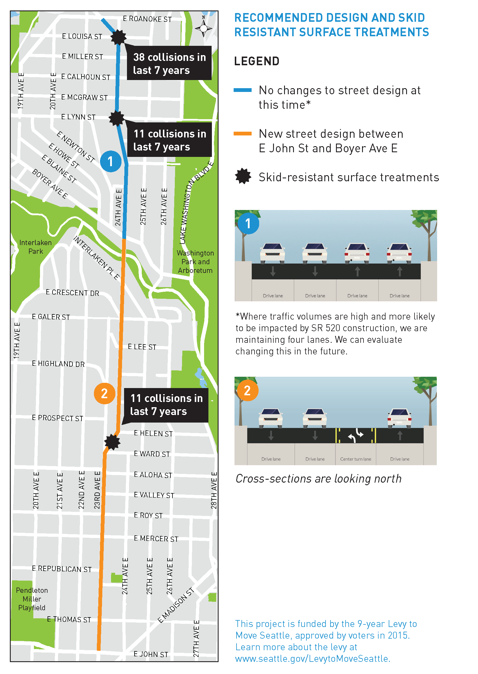 On the segment north of Boyer Ave E, nothing will be changed about the street whatsoever. At E Louisa St, there have been 37 collisions in the seven-year period that SDOT examined for their outreach materials, but the street will be kept as-is, with two fast-moving traffic lanes in each direction. The primary reason for this decision is the impending makeover for Montlake Boulevard as part of SR-520. Construction on the Montlake Interchange reconfiguration is slated to begin in the fall and continue through 2022 or 2023. With the state transportation department being allowed to construct highway-style infrastructure on our city streets, it isn’t much of a surprise that SDOT is assuming that vehicle volumes will be too high to warrant lane reductions. In addition, the local Montlake business community has stated a preference to retain existing on-street parking for the small section that has it.