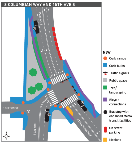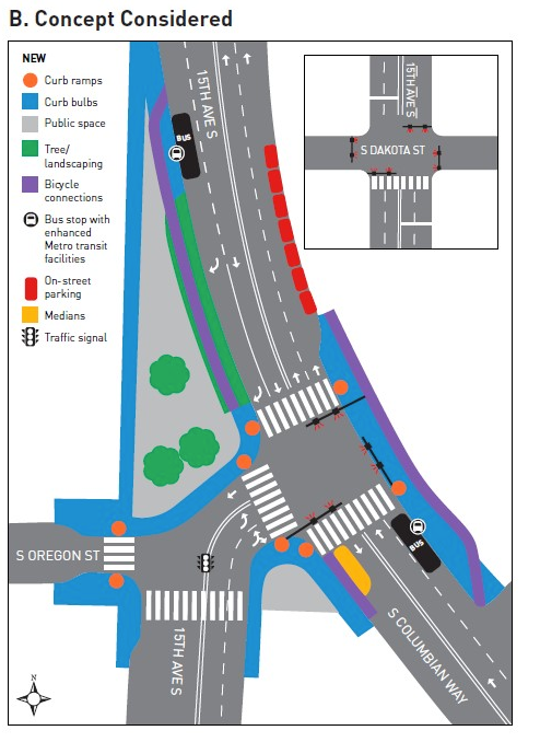 One project, however, remains stalled due to community pushback. Last summer, I wrote about how an attempt to tame an overbuilt intersection at 15th Ave S and S Columbian Way in Beacon Hill was generating pushback from community members. The project aims to square off the spot where 15th Ave S bends to meet S Columbian Way by converting some street space into a public plaza. The intersection is one block away from Mercer Middle School, and teens from the school use the intersection before and after school to access buses on 15th or Columbian.