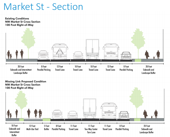 An encouraging sign is the inclusion of broader safety improvements on Market Street that will benefit all street users. A four to three lane road rechannelization (a.k.a. road diet) would not only create space for the protected multi-use facility, but also encourage lower speeds and safer turning and passing maneuvers at the messy intersection with 24th Ave NW.