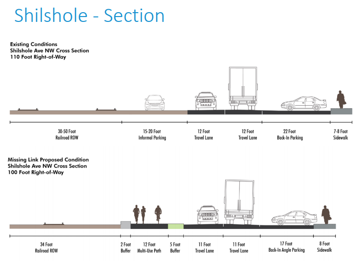 On Shilshole, SDOT would find room to continue the mixed-trail by replacing the informal walking path on the south side of the road and reducing the lane widths from the existing 12 feet to 11-foot lanes. Parking is maintained on the north side, but is slimmed down from 22-foot back-in parking to 17-foot back-angle parking. This should also make parking maneuvers less dangerous since turning from 90 degrees is a slower and more cumbersome movement.