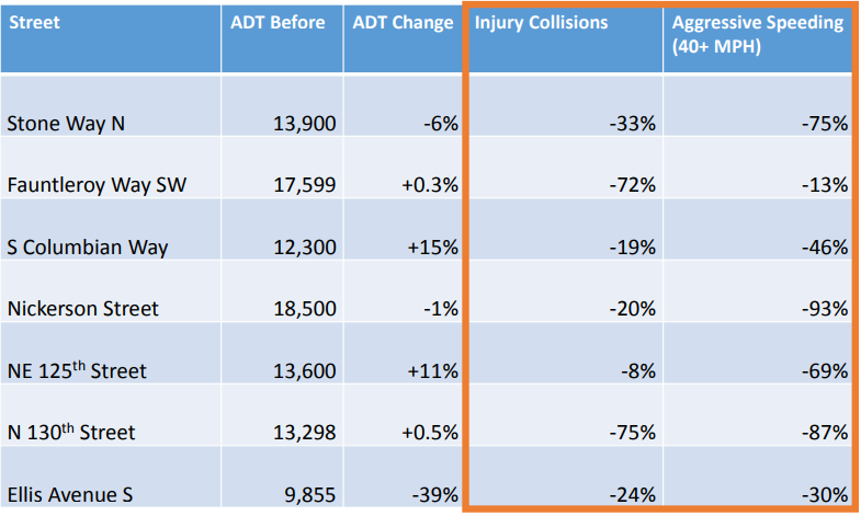 SDOT offered some data that builds a compelling case that rechannelizations both improve safety and improve flow. Notice Fauntleroy Way SW and N 130th St which saw injury collisions drop by more than 70%. Nickerson Street saw “aggressive speeding” drop 93% following a rechannelization and Stone Way N saw a 75% drop. Rechannelization could broaden the impact of Missing Link project to make Market Street a safe “Complete Street” in the redesigned segment.