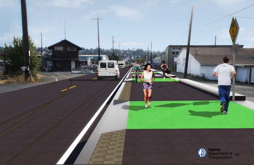 SDOT plans to add a westbound lane for cars where none exists today by reclaiming space from dormant railroad right-of-way and taking a few feet from parking/loading area. So, don’t say cars don’t get anything from this project.