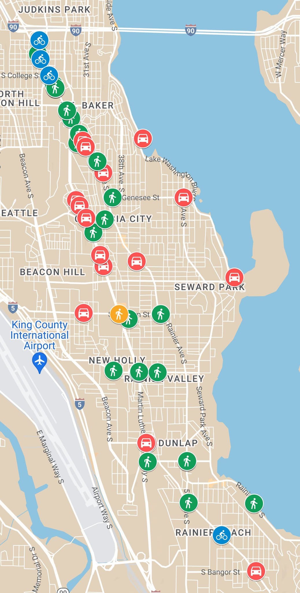 Rainier Valley Greenways, an advocacy group focused on improving safety and mobility in Southeast Seattle, created a different map, showing crashes that have occurred just since the start of the “top-to-bottom” review in early September 2022. The result, particularly along different segments of Rainier Avenue that have been treated very differently by the city, is stark. The map includes very few crashes on Rainier through Columbia City, where the city reduced the total number of lanes to improve safety in 2015.