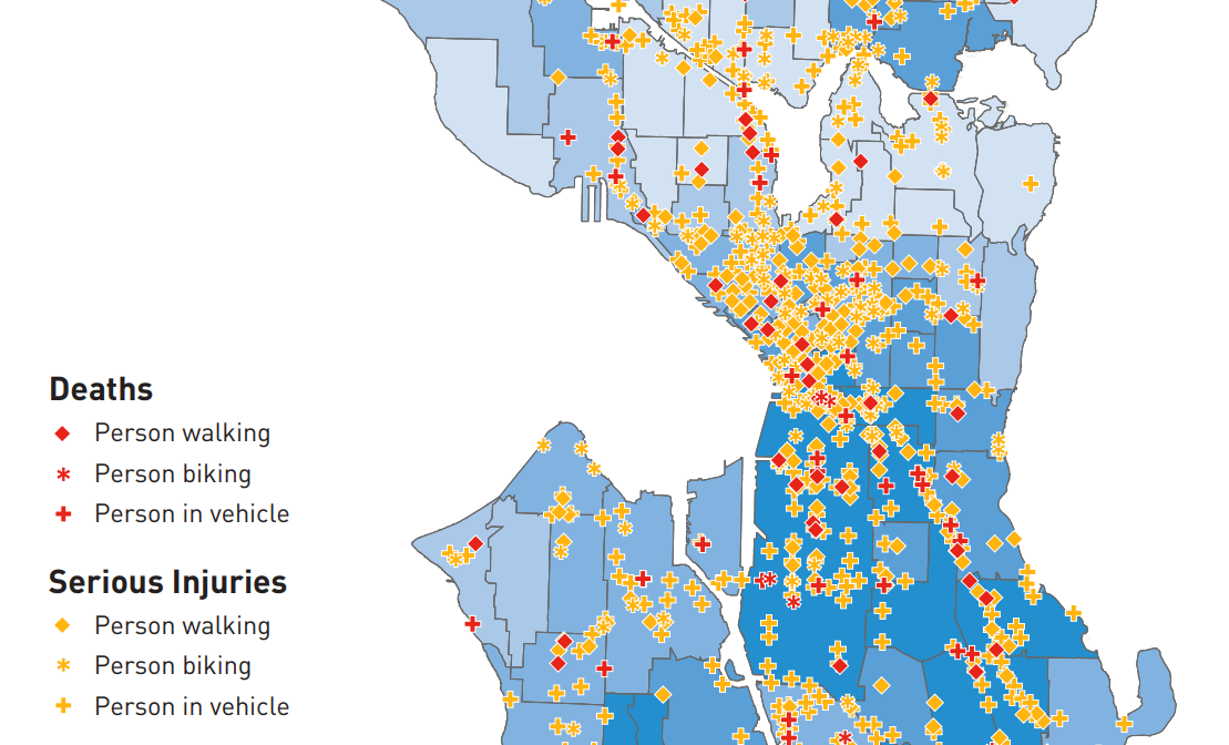 The report includes a map showing where fatal and serious injury crashes have occurred in the city since 2015, when the city first launched the Vision Zero program. While the data makes pretty clear where the most dangerous areas of the city are — wide arterial streets, particularly in South Seattle, and downtown — it’s minimally helpful in figuring out where safety interventions have been working. The city instituted multiple phases of improvements to Rainier Avenue, for example, implemented at different times. Clumped together in this analysis, it is impossible to move forward without knowing which were effective.