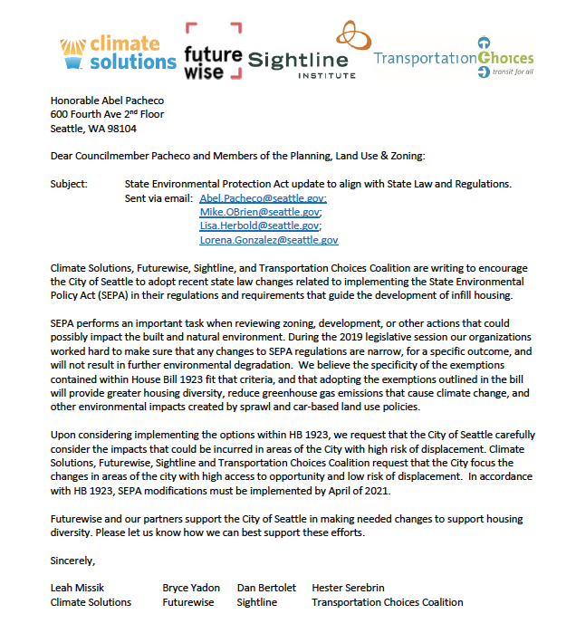 In a letter addressed to the council encouraging them to take advantage of the SEPA reform opportunities presented in House Bill 1923, advocates acknowledged the importance of equity considerations and urged the council to “focus the changes in areas of the city with high access to opportunity and low risk of displacement.”
