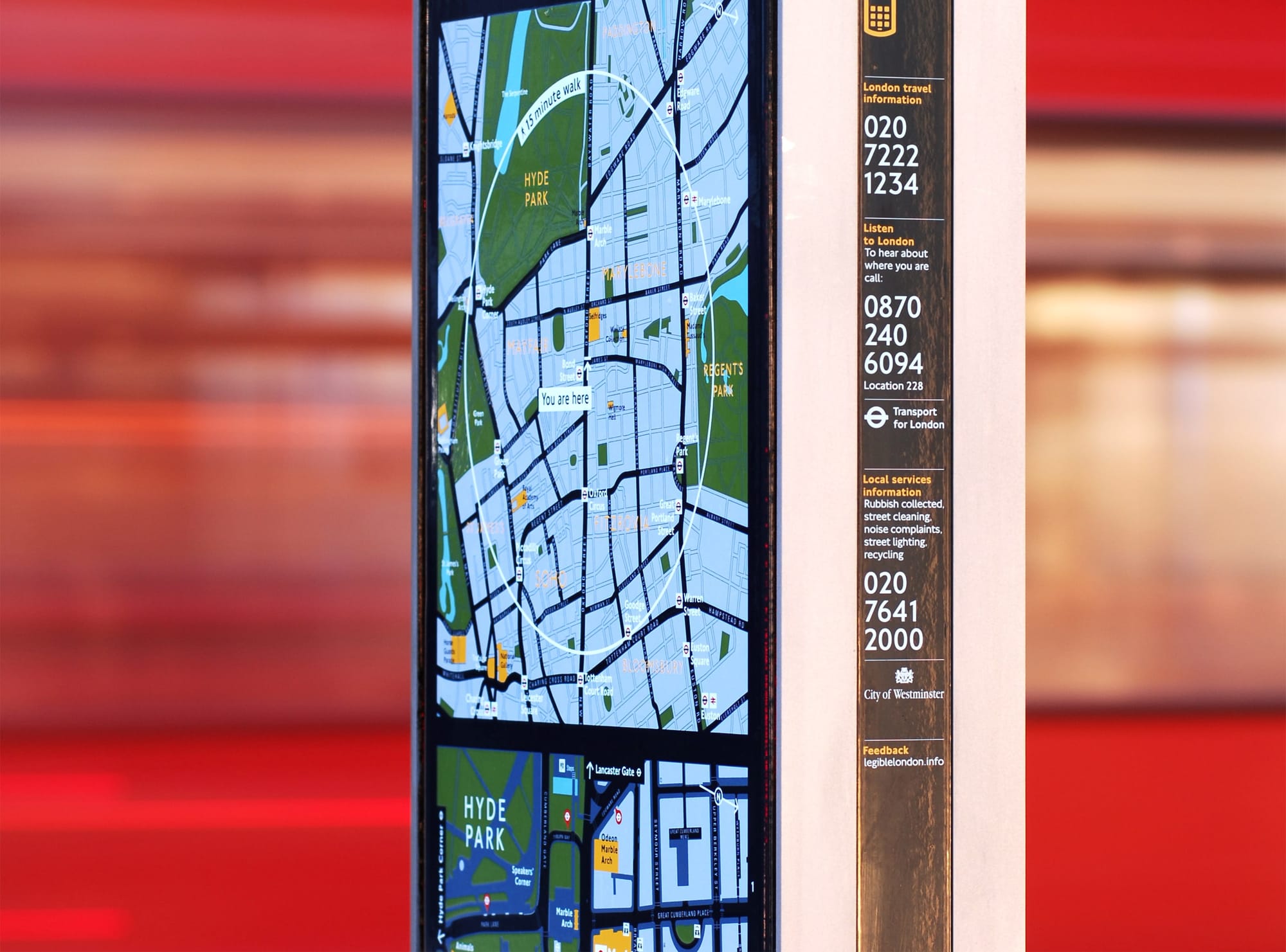 - Area Sign – Placement at major decision points in busy environments like outside transit stations to allow users to plan both local destinations and longer journeys with two maps of different scales;