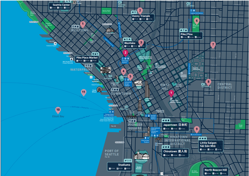 Sign maps will come in three sizes, and feature simple landmark illustrations, transit links, and key destinations. In addition to signs, maps will also be featured in bus and streetcar shelters and in stations. A printed map has also been developed for the pilot to raise awareness of Seamless Seattle.