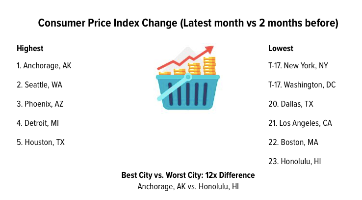 Just like not all areas of goods and services have increased commensurately in price, not all metro areas have seen the same level of price increases. Looking at prices increases compared to a year ago, nationally the city that tops WalletHub’s list for inflation is Anchorage (12.4%), followed by Phoenix (12.3%), Atlanta (11.5%), and then Seattle (10.1%).