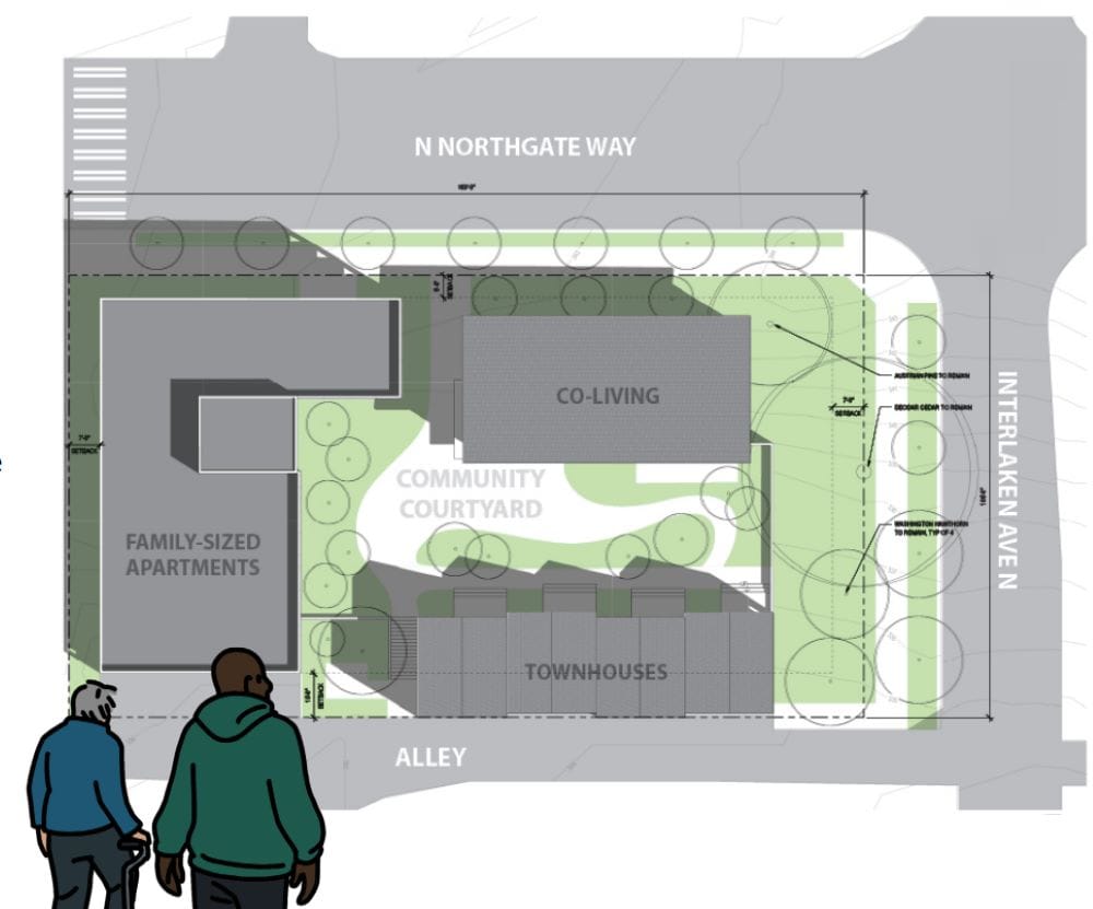 In support of their effort to build social housing in Seattle, the nonprofit House Our Neighbors recently released architectural designs for transforming a piece of surplus publicly-owned land in Northgate. In the vision, designed by Neiman Taber Architects, a row of townhomes, a block of family-sized apartments, and a wing of co-living efficiency studios are wrapped around a central courtyard.