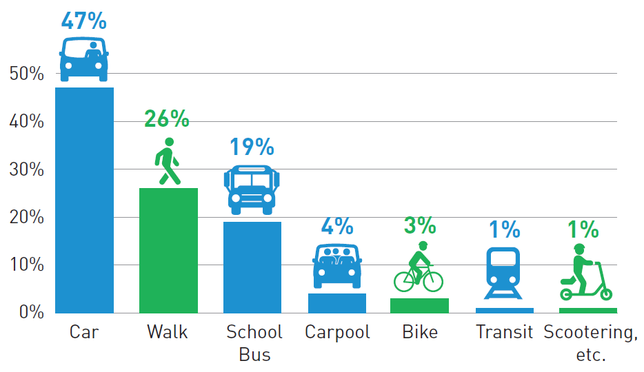 These shifting patterns have meant increased reliance on school buses and on parents driving their kids to school, which in turn increases car traffic near schools and makes it more dangerous and unpleasant for those still walking, rolling, or biking.