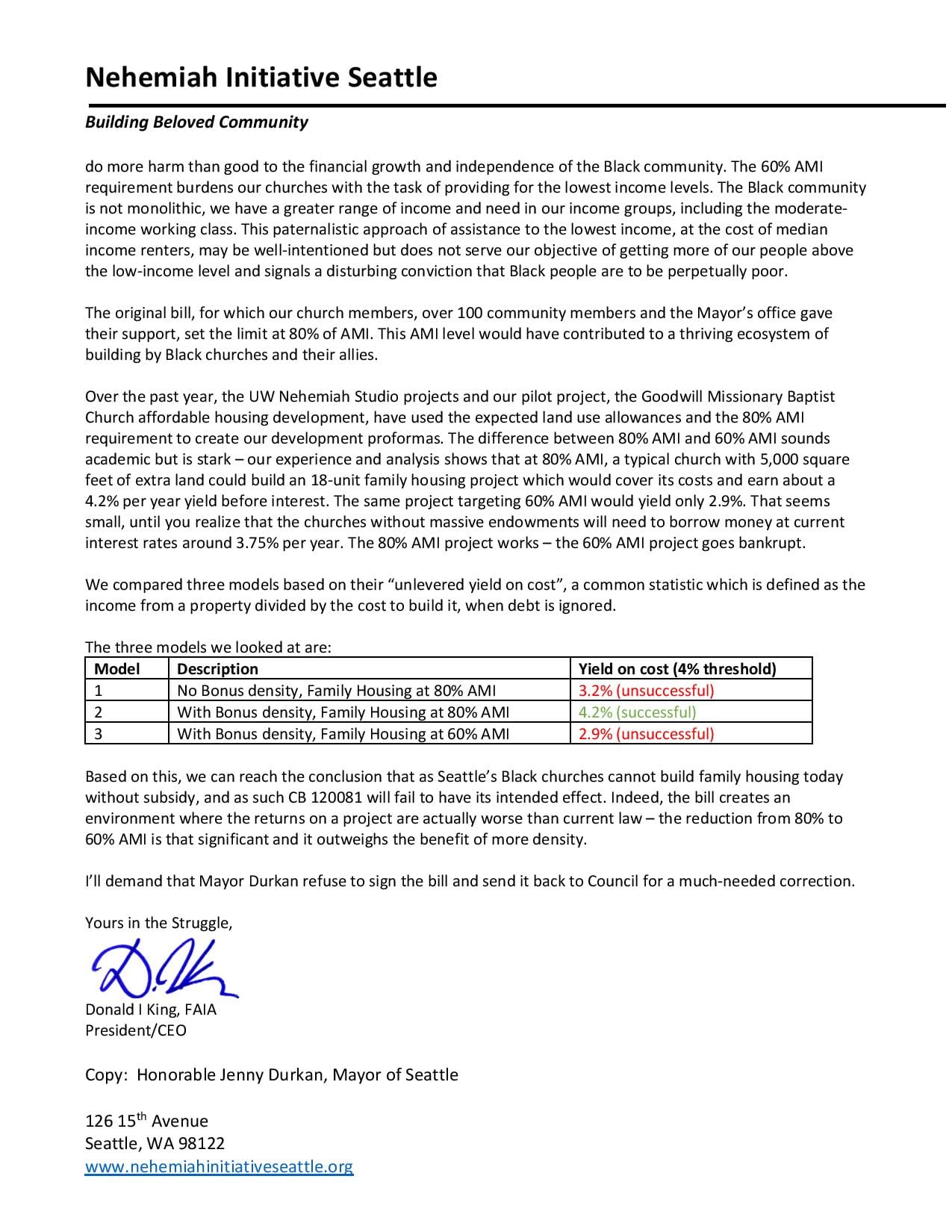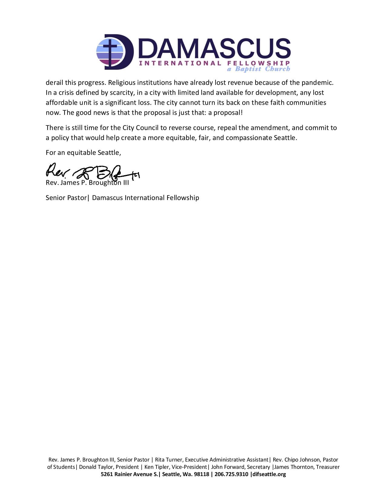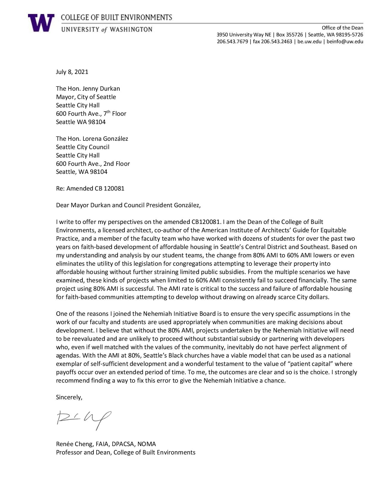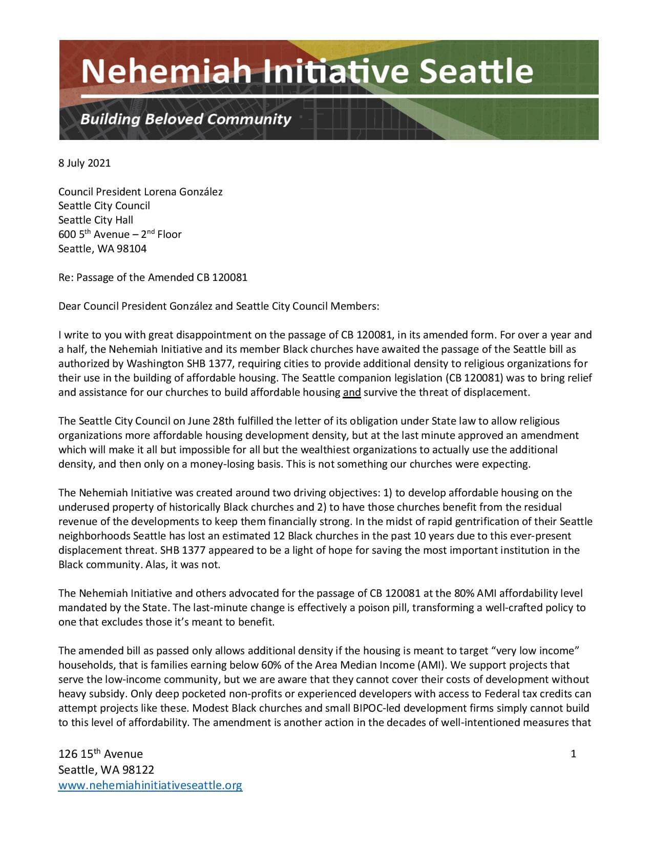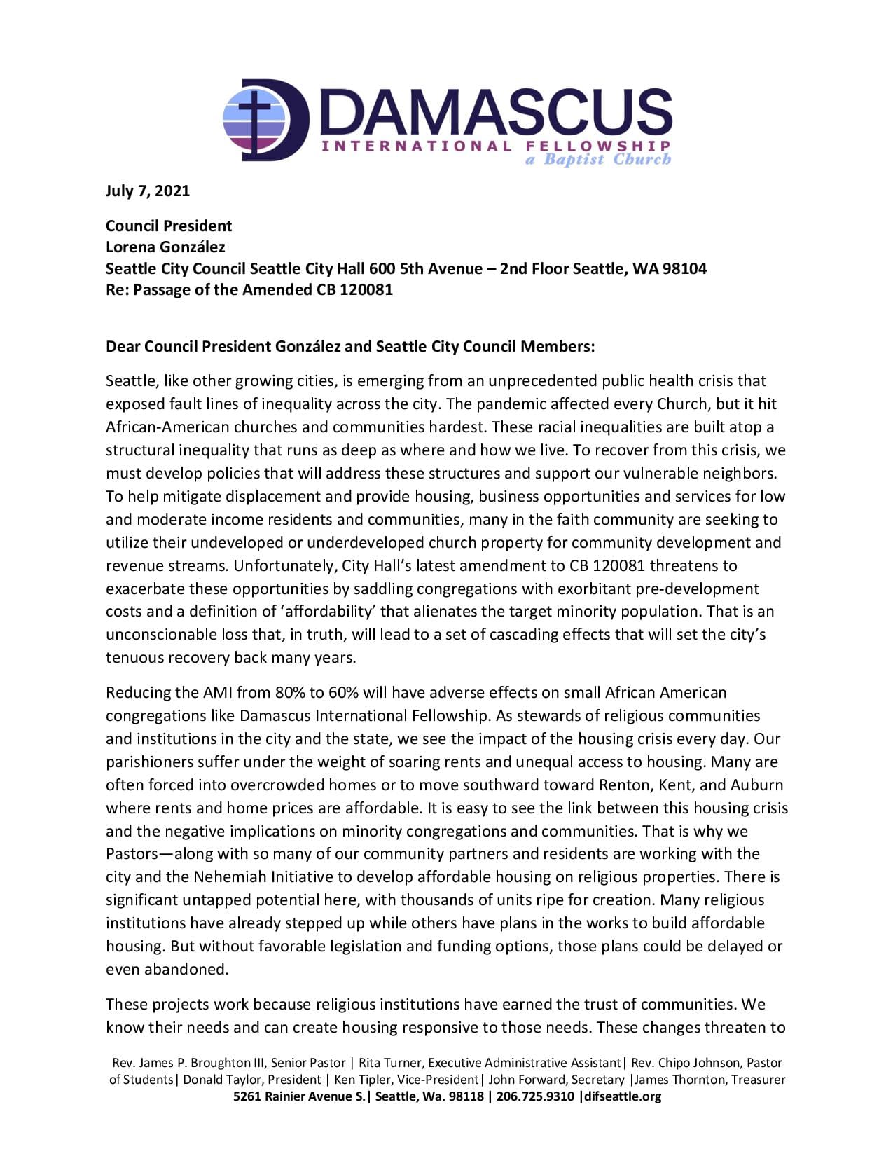 Reverend James P. Broughton III, Senior Pastor of Damascus International Fellowship, located in Rainier Valley, and Renée Cheng, Dean of the College of Built Environments at the University of Washington (UW) and Board Director of the Nehemiah Initiative, have also submitted letters to city leadership expressing disappointment with the amendment and hope that the mistake will be quickly remedied.