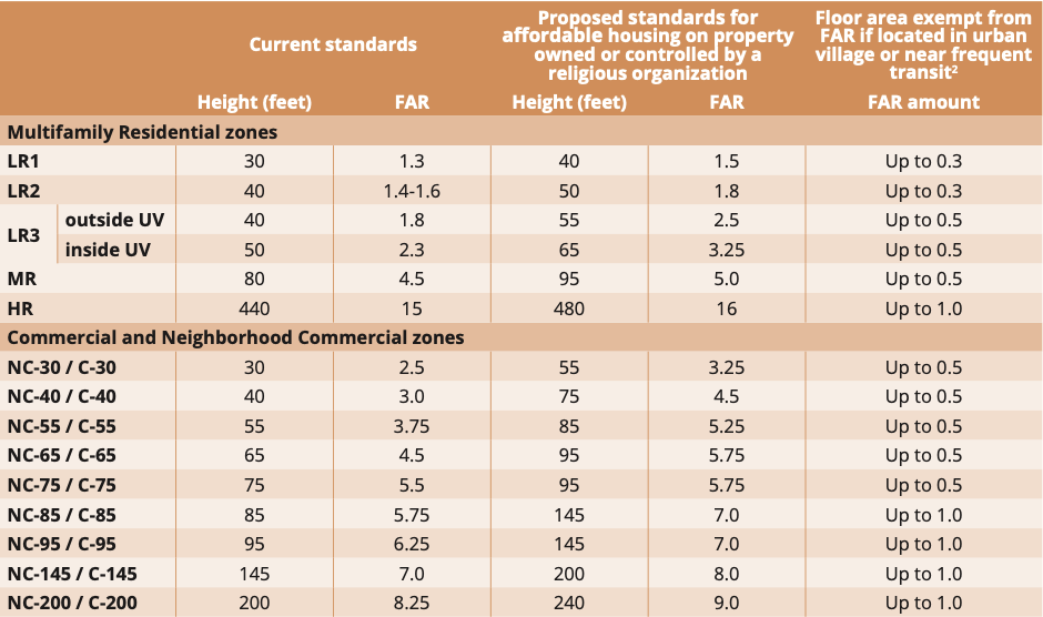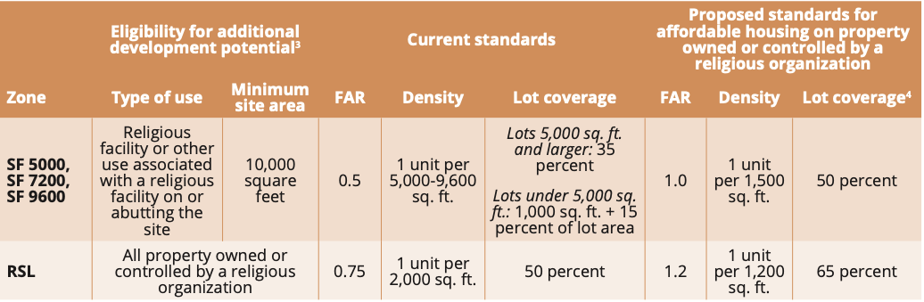 Property owned or controlled by religious institutions can be found in all corners of Seattle, but the Central District has an especially high number of properties located in urban village zones. Roughly 18.1 acres of land owned by religious institutions fall within the boundaries of the 23rd and South Jackson urban village, by far the highest percentage of any urban village in the city. Density bonuses differ based on existing zoning designations and affordable housing constructed in commercial and multifamily residential zones tend to receive the largest density bonuses.