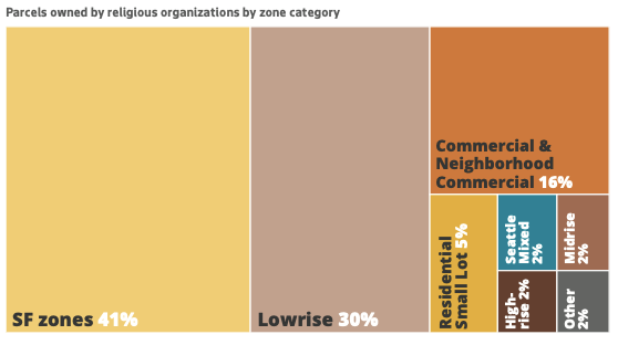 But while religious institutions can expect to face fewer future hurdles, many other Black churches may never be able to leverage their land as Good Shepherd has. This is especially true for religious institutions whose land falls in single-family and lowrise zones, which have more modest density bonuses. Over 70% of land parcels owned by religious institutions are located in areas of Seattle zoned for lower density.