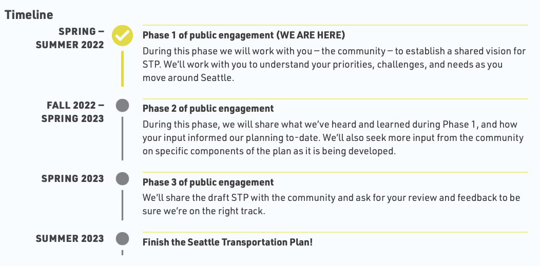 The timing of the STP’s creation is critical — in 2024, the $930 million Levy to Move Seattle will expire, setting the stage for a new nine-year transportation levy to go before voters. At the same time, the City is engaging in planning efforts for a major update of its Comprehensive Plan, a tool used to inform major city government decisions shaping the next 20 years of city growth. Considering the magnitude of the impact STP will have on Seattle’s future, advocacy groups, including The Urbanist, are encouraging an all hands on deck approach.