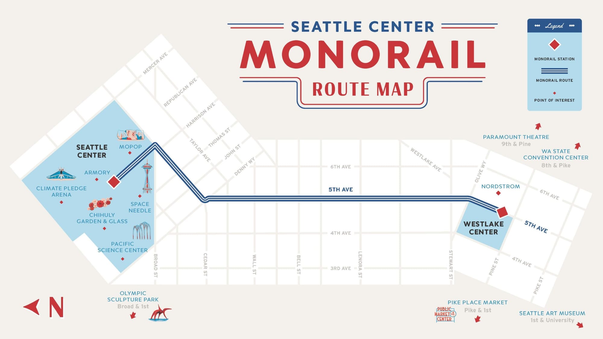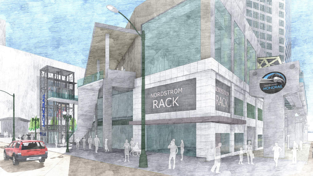 The City of Seattle is looking at additional, longer-term changes to the Thomas Street corridor, which includes several small retail stores near the monorail entrance. Ultimately, an ADA ramp that doesn’t include any sharp turns is envisioned, but not immediately planned for implementation. The primary east-west pedestrian corridor through Seattle Center, Thomas Street, has a lot of potential that will be enhanced with better access to the monorail station.