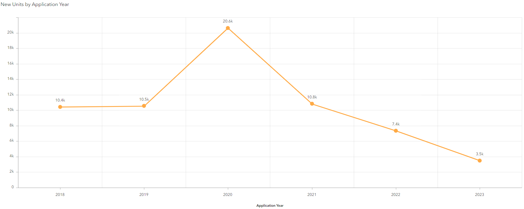 The city is already seeing a sharp decline in the number of new housing permit applications, even as a significant number are finally coming online after entering the development pipeline years ago. Builders have cited high interest rates, jumps in labor and material costs, Seattle’s Mandatory Housing Affordability fee added in 2019, and stringent building code updates as contributing factors to the slowdown, which has no one single cause.
