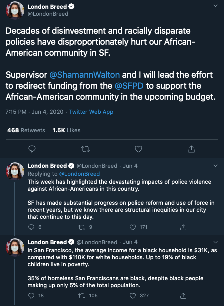 In San Francisco, Mayor London Breed and Supervisor (councilmember) Sherman Walton have called for what local NPR station KQED describes as an “unspecified amount of funding” from police department’s budget to be reallocated to support programs in the city’s African-American community as “a reparation for city polices that led to ‘decades of disinvestment.'”