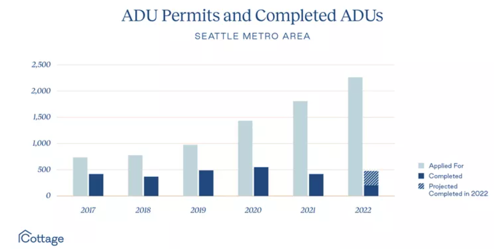 Rising costs and unexpected fees appear to be contributing to a trend of homeowners sitting on ADU permits rather than moving forward. Only 37% of ADU permits submitted to Seattle between 2017 and 2021 resulted in a completed building, Alex Czarnecki, founder of Cottage, a platform that assists with ADU construction, reported in 2023.