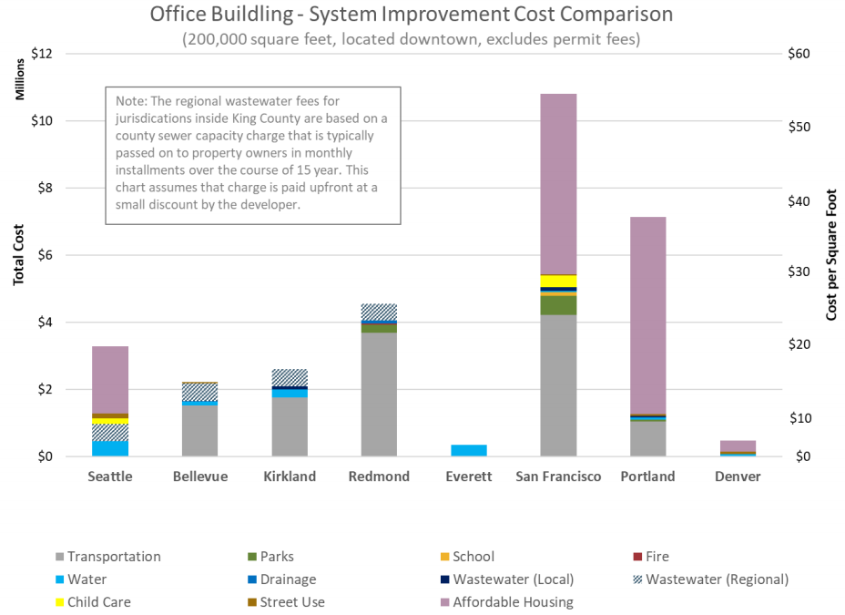 Transportation impact fees are just one part of overall system improvements (e.g., parks, emergency service facilities, child care, affordable housing, and water and sewer connection contributions) that developers are often responsible. Looking at the wider range of obligations, Breiland highlighted how Seattle compares to peer and regional cities when it comes to a range of system improvement types. She illustrated this through three hypothetical development scenarios (e.g., medium single-family home, large multifamily development, and large office development) and their system improvement responsibilities. Seattle stacks up toward the lower-middle of the pack and at the very bottom for single-family homes when excluding sewer connections.