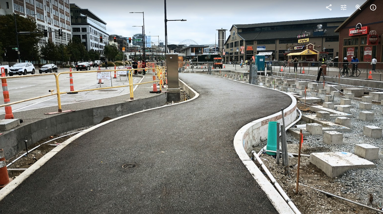 Downtown, on some of the most important bike facilities in the entire city, upgrades are going into place now that finally add concrete protection between drivers and people on bikes and that also fill in some incredibly key gaps. The upgrades are pricey, funded by a combination of dollars from the Seattle waterfront local improvement district and contributions from the new Seattle Convention Center in exchange for public land. And yet constraints will remain in place that cap the capacity of the system and make hopping on a bike less attractive.