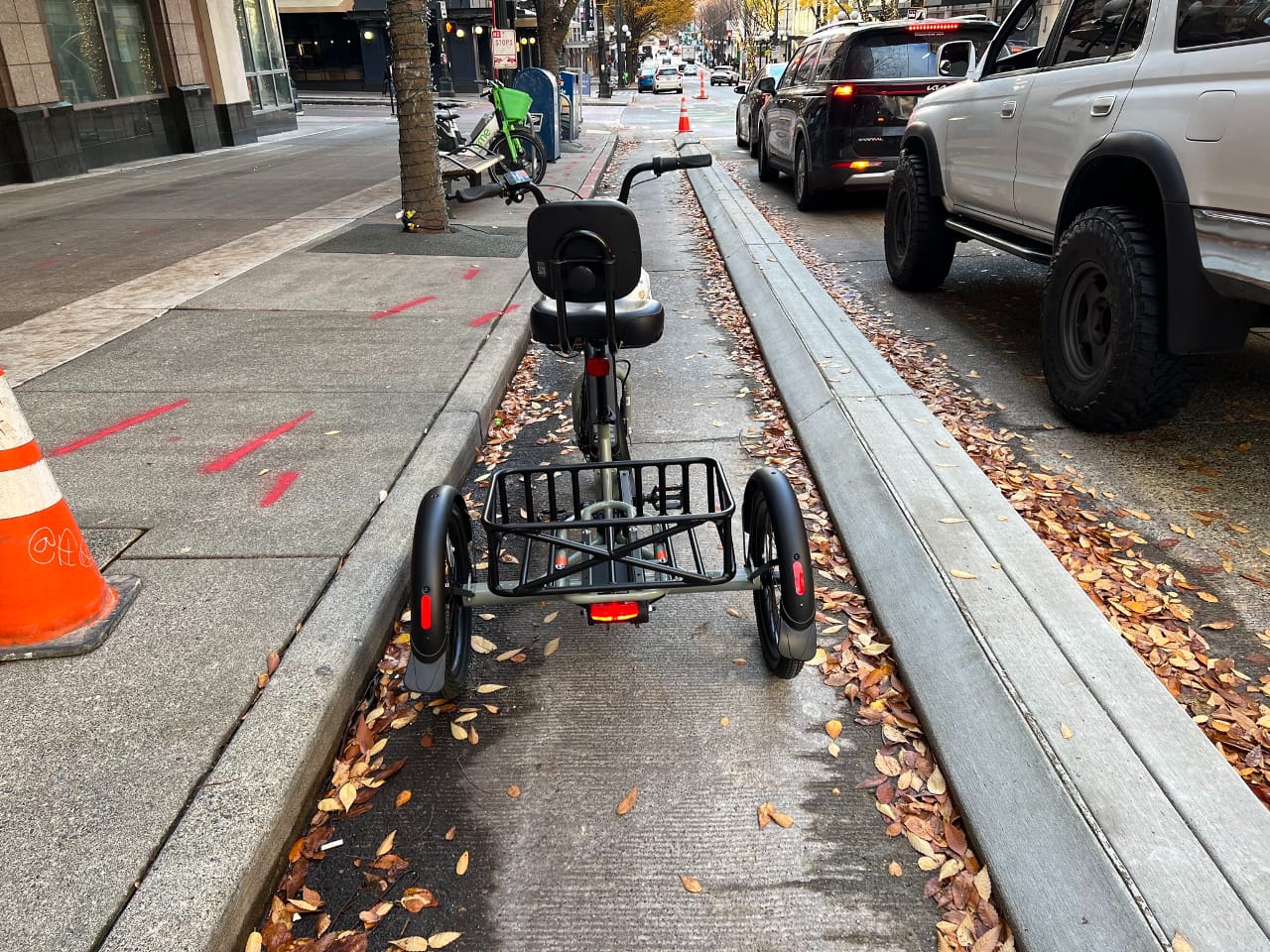 A photo submitted by a reader shows their cargo tricycle, which comes in at a little less than three-feet wide, only able to fit in the new lane with a few inches of clearance on either side.