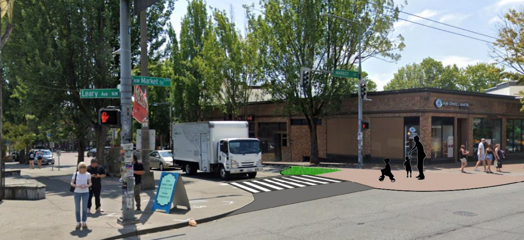 The designs feature a 10-foot multiuse trail along the busy Market Street and Leary Ave sidewalks, with no buffer between them. At intersections like Ballard Avenue NW and 22nd Avenue NW crosswalks will be raised, but the full combined width of the trail and the sidewalk will narrow down at the crossing, adding to conflicts between people walking and biking along the stretch.